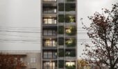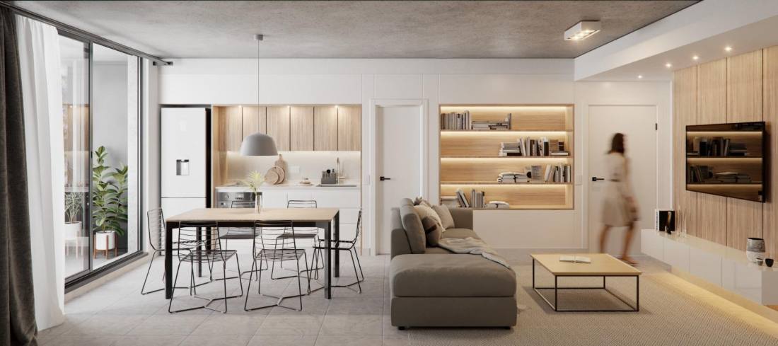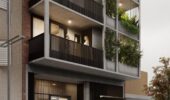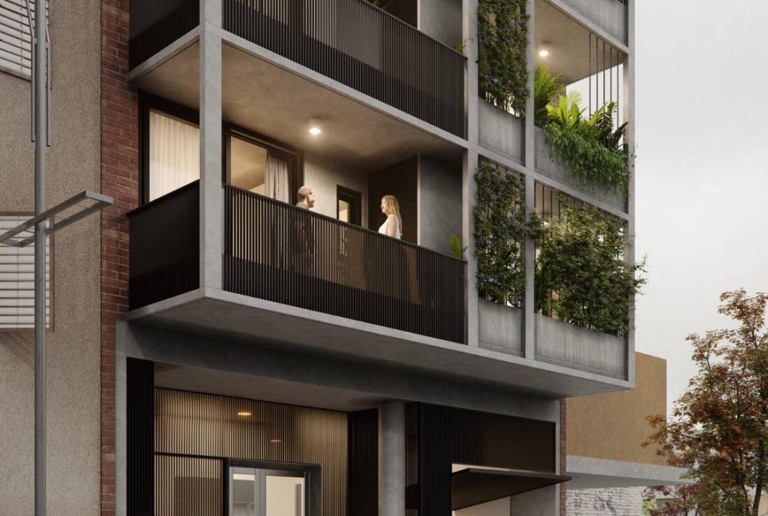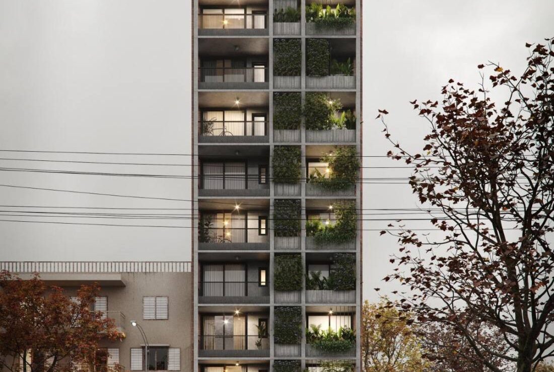 El edificio incluye monoambientes, unidades de 1 y 2 dormitorios, espacios de estacionamiento en planta baja y bicicleteros. En la azotea, se encuentra un quincho de uso común y un espacio de solárium con duchas. Fecha de entrega estimada para segundo semestre de 2027